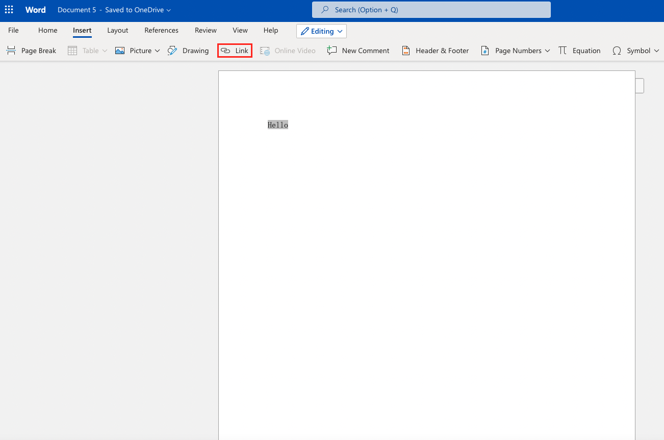 5. Press Ctrl + K (PC) or Command + K (Mac) to open the Insert Hyperlink window. Alternatively, you can get to the menu by selecting the Insert tab and then clicking the Link button in the relevant toolbar.