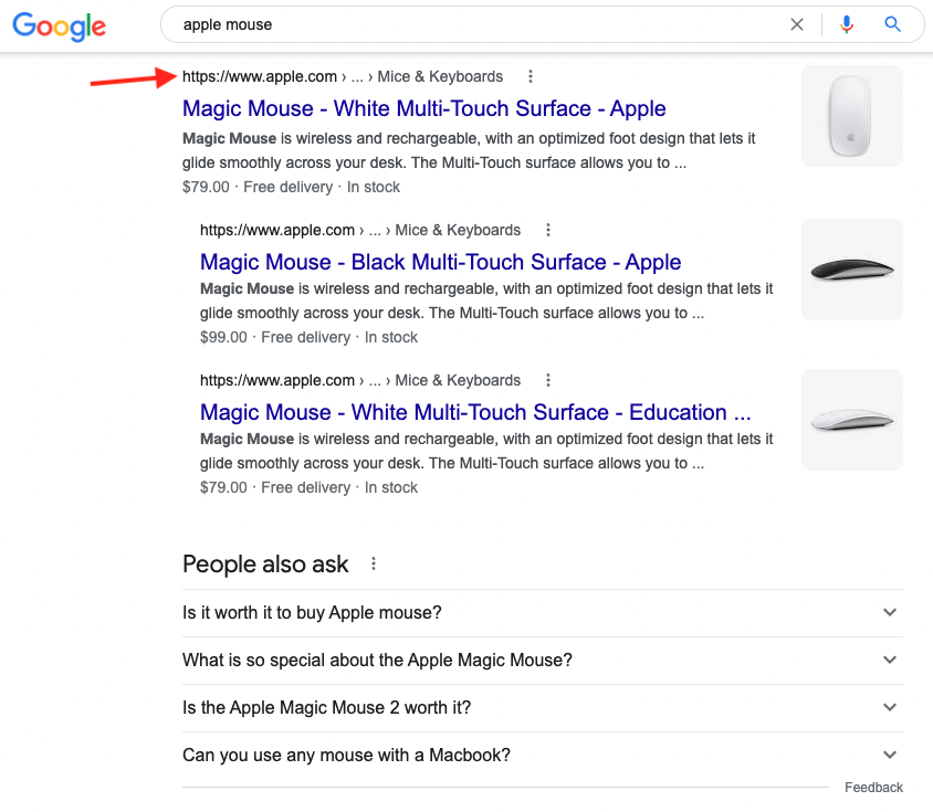 Let's say you google 'Apple wireless mouse'. Google is smart. It knows you most likely want to buy one, so the top results will be sellers selling wireless Apple mice. It'll even direct you to its 'Shopping' tab, where you can see stacked images and prices.