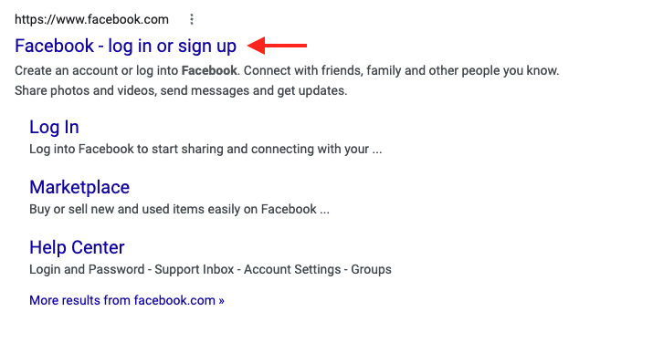 These SERPs will be pretty streamlined. When users have navigational intent, they are usually looking for a specific website. For example, they might have typed 'Facebook' into the search bar. So that will be the first result. Google will make a fairly educated guess that the user intent is navigational, and they want to go to Facebook.